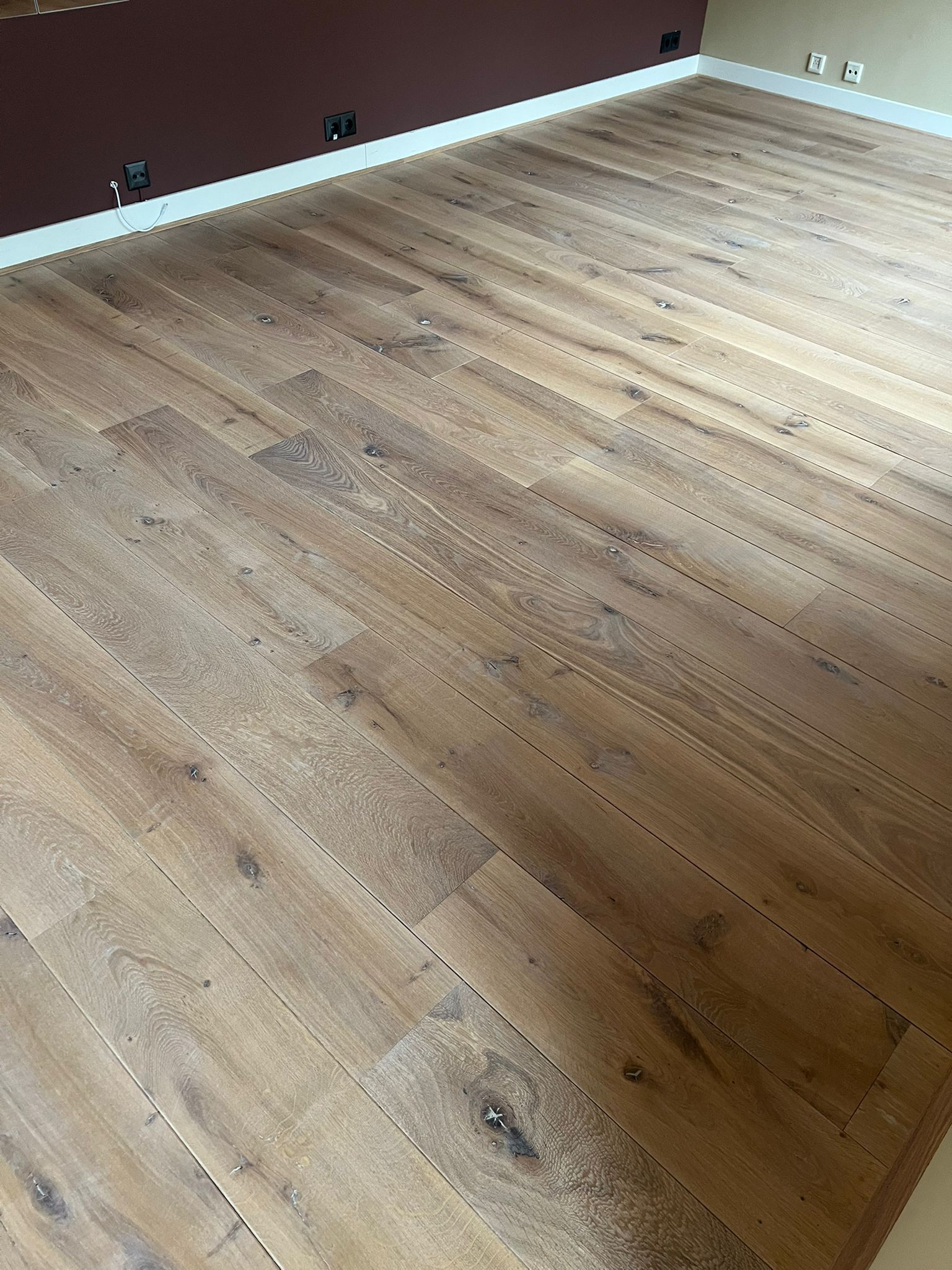 Deze eiken vloer is gerenoveerd incl vellingkanten frezen. Hij is afgewerkt met monocoat 2-K olie kleur smoke5%. De lichte rooktint geeft de vloer extra karakter.